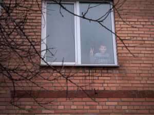 Nous visitons l’orphelinat d’Enakievo. Les enfant, d’environ 6 à 10 ans, nous attendent dans leur pièce de vie, assis sagement sur des chaises. Quand nous leur disons d’où nous venons, ils ouvrent de grands yeux. « Des Français, des vrais ?! », demande l’un d’eux. Nous discutons, nous jouons avec eux et nous leur offrons des chocolats. À notre départ, plusieurs nous sautent dans les bras.