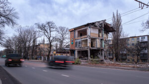 La ville est en effervescence : partout, des tracteurs poussent des tas de terre ou des arbres entiers. Pour venir ici, nous avons emprunté une route en très mauvais état, qui nous a secoués tous le long du trajet comme des colis jetés au fond d’un camion. Et d’un coup, plus rien : la route est soudainement impeccablement neuve. Elle s’étire comme un serpent bleu foncé au milieu de la boue noire. « Il y a quelques jours, ici, je roulais dans la boue », remarque Vadim Et quelques semaines plus tôt, il progressait au milieu des ruines ; aujourd’hui un immeuble tout neuf se dresse à notre gauche, et sur notre droite un chantier sort de terre. La ville se reconstruit à toute vitesse. Vadim nous explique que Volnovakha a reçu le soutien d’une région du nord-est de la Russie : des fonds ont été levés là-bas et envoyés ici pour la reconstruction. La ville est pour le moment un curieux patchwork de ruines et de bâtiments neufs.