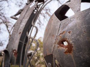 Quelques minutes après, nous verrons ce que ça fait quand l’ambiance se refroidit. Alors que nous traversons un parc où les sculptures de métal érigées avant le conflit portent toutes des traces d’éclats, une explosion retentit, plus forte que les précédentes. Et Vadim fait demi-tour et part en courant vers la voiture. Nous ne pouvons rien faire d’autre que le suivre, en nous demandant quand même un peu ce qu’on est venus faire dans cette galère. À côté de nous, deux jeunes que nous avions croisés devisant gaiement sur un banc y sont toujours alors que nous démarrons sur les chapeaux de roue. Ils n’ont pas bougé.