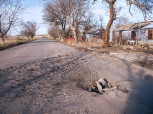 À Dokuchaievsk, une roquette est encore plantée dans le goudron de la route. Autour, toutes les maisons portent les stigmates d’explosions. Certaines semblent pourtant encore habitées… Le village a été longtemps dans la zone grise entre les lignes de front. Les champs autour du village ont été déminés depuis ; « Personne n’ose y aller quand même », précise Vadim De toute façon, reste-t-il encore des hommes en âge de travailler la terre dans le village ?