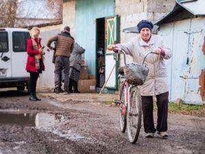 À Volnovakha, nous apportons une caisse de médicaments à une association locale qui vient en aide aux personnes âges dans le besoin. L’une d’elles est là quand nous arrivons. Elle reçoit ses médicaments.