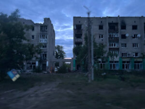 Popasna ressemble presque à Stalingrad après le siège : aucun bâtiment n’a été épargné par les combats et les bombardements. Nous y arrivons alors que la nuit commence à tomber. Nous nous arrêtons sur ce qui reste d’une place ; des silhouettes sortent des caves des immeubles autour. Ambiance d’apocalypse… En plus des distributions habituelles, nous avons apporté plusieurs générateurs électriques à ces gens qui survivent ici depuis presque deux ans, la plupart du temps sans eau courante ni électricité. Ici, nous sommes au fond de la misère ; les visages sont tirés, les vêtements semblent n’avoir pas été lavés depuis des mois, voire plus. Notre présence ne déclenche même pas cette étincelle qu’on voit habituellement dans les regards, malgré les remerciements sincères que nous recevons et les sourires esquissés. Au fond des yeux, nos hôtes n’ont plus que lassitude et angoisse. Nous repartons rapidement pour ne pas attirer l’attention sur eux. Ils repartent dans leurs habitations de fortune. Nous laissons l’enfer dernière nous ; eux se replongent dans ses entrailles.